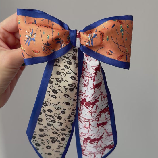 Jedes Band erzählt seine eigene Geschichte und fügt sich wie die Seiten eines alten Skizzenbuchs harmonisch zusammen – zarte Blüten, filigrane Zweige und handgezeichnete Motive vereinen sich zu einer eindrucksvollen Silhouette. Sie ist die Schleife für das Mädchen, das sich bewusst kleidet und keine Angst vor Texturen, Mustern oder einem Hauch von Dramatik hat.