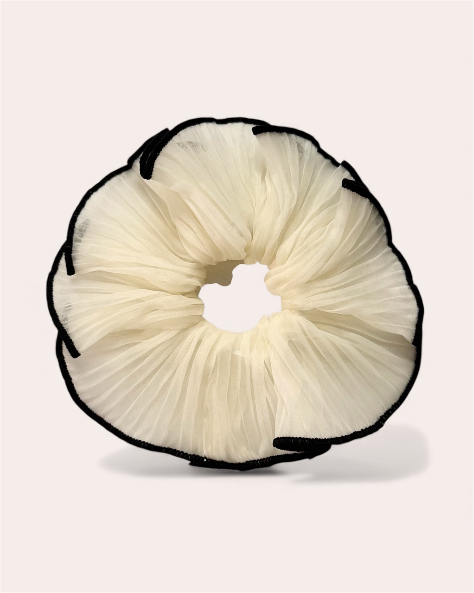 Florence Ivory Organza-Haargummi mit Rüschen und schwarzem Rand – Übergroßes monochromes Haargummi