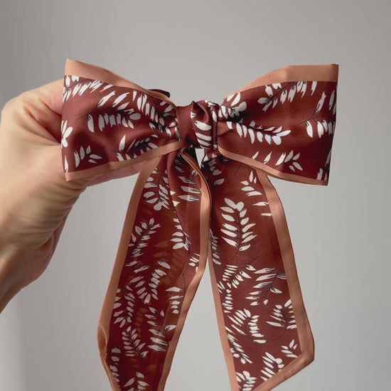 Ottavia verkörpert bodenständige Eleganz – eine Schleife in warmen Farbtönen, die an den Herbst erinnert und sich seidig weich anfühlt. Sattes Schokoladenbraun trifft auf zarte Pflanzenmuster und kreiert so einen Look, der erdig, nostalgisch und mühelos raffiniert ist.