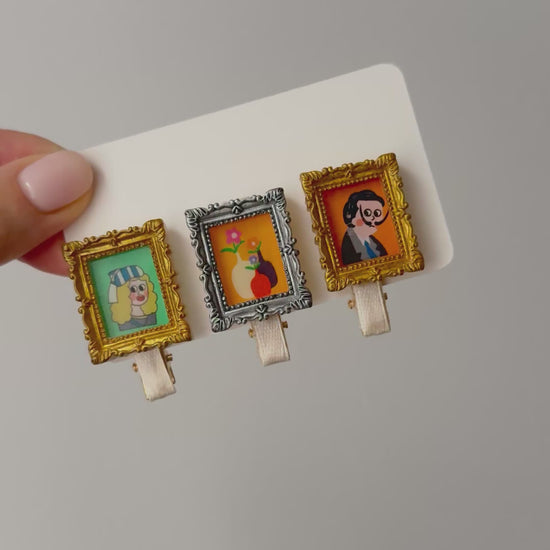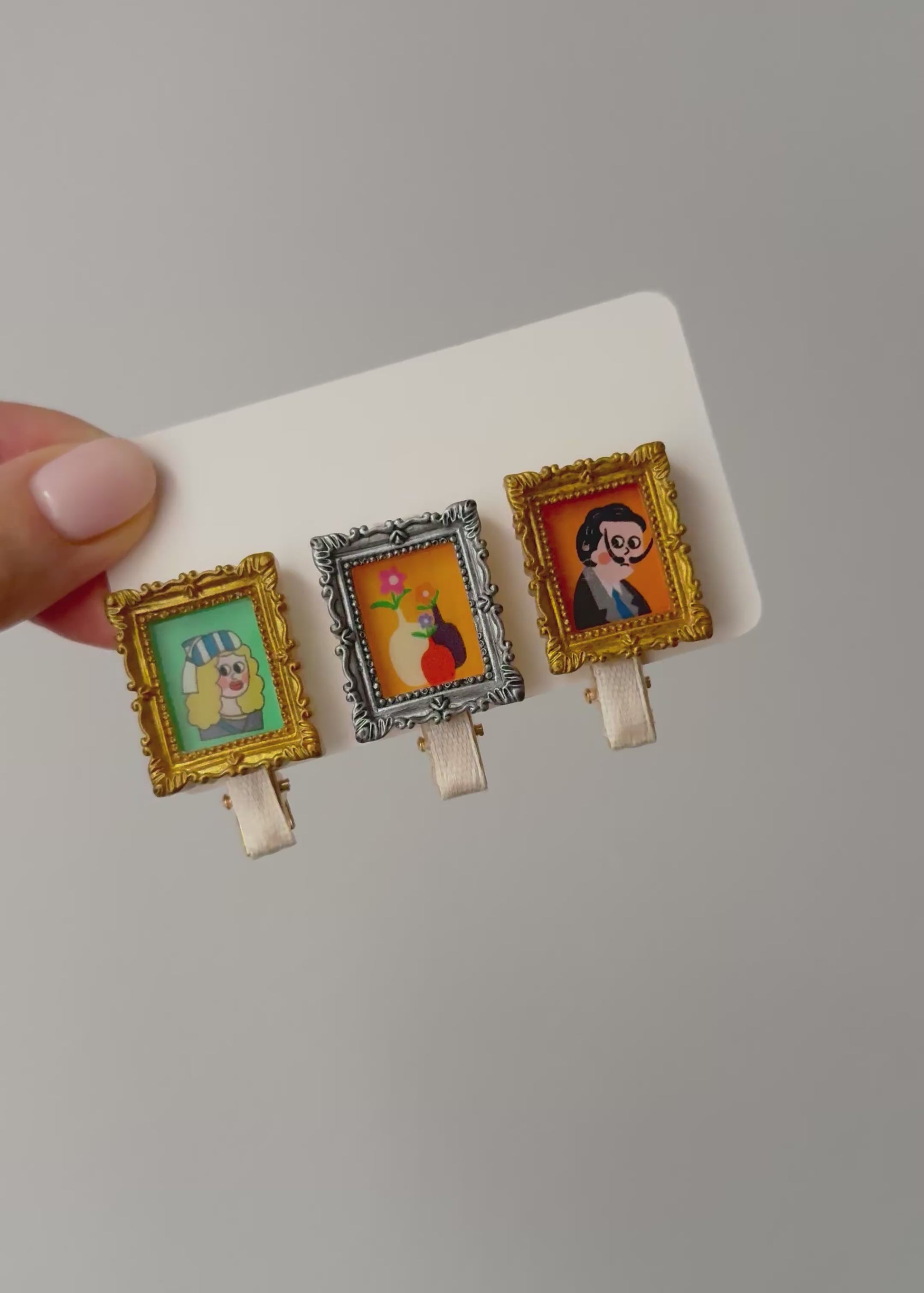 Each clip features a tiny framed “painting” with a vintage gallery-style frame, adding a playful, creative twist to your hair. Wear it to pin your bangs, decorate a braid, or add a fun accent to your everyday style — it’s guaranteed to spark smiles and start conversations.