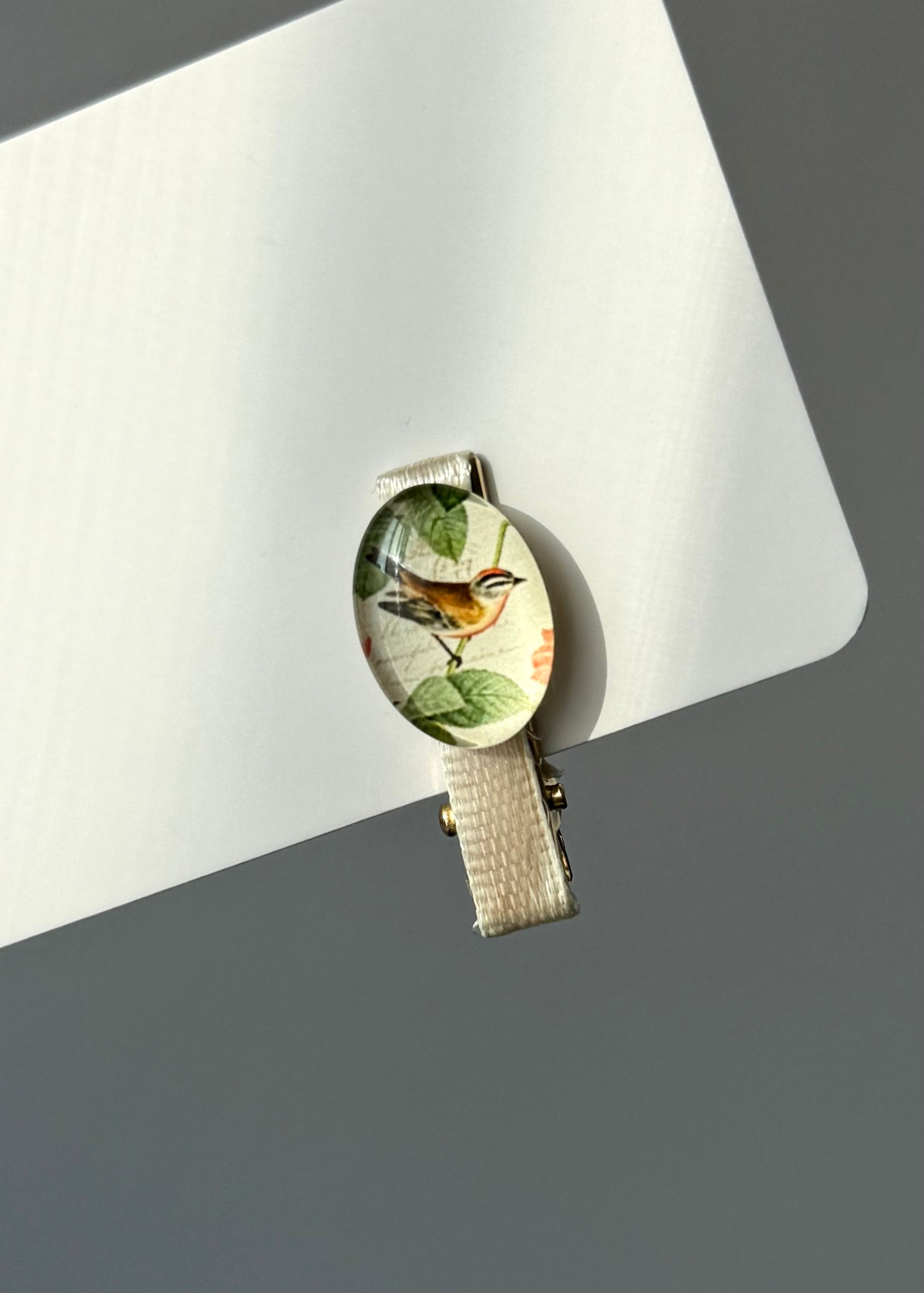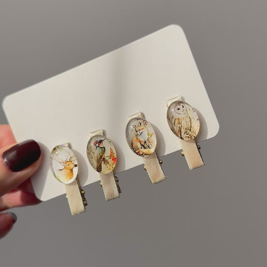 This vintage-style woodland hair clip brings a soft, nostalgic charm to any look. Each hair clip features a detailed illustration — birds, owls, or forest animals — sealed under a glossy dome that gives the artwork a timeless, old-book feel.